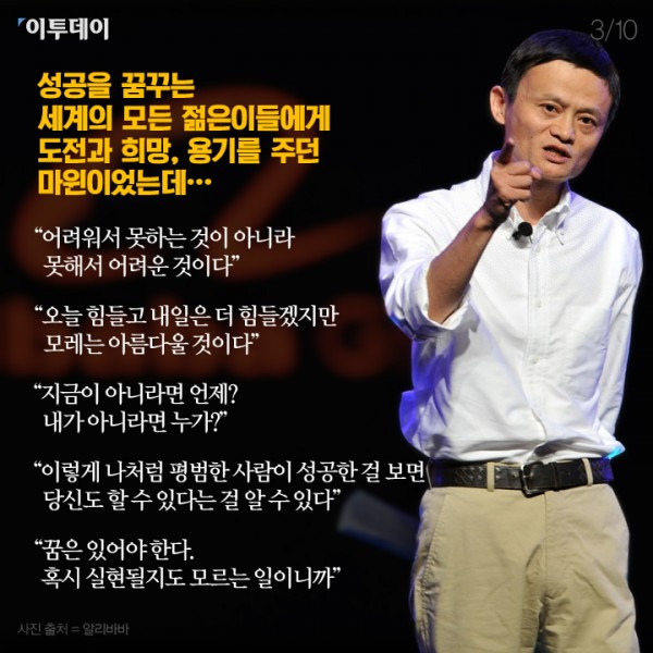中 '미운털' 알리바바 반독점 조사·앤트그룹도…마윈 손보기? 알리바바 마윈 회장 알리바바 마윈 회장이 청춘에게 하는 말 문장력을 키우는 10가지 방법 인생을 바꿀 탈무드 명언 14선 성공을 위한 20가. «#독서 조금 늦게 시작하는 마윈~~~!! Read reviews from world's largest community for readers. 전자상거래 업체 알리바바 창업자이자 중국 최고 부호인 마윈(馬雲) 전 회장이 신종 코로나바이러스 감염증(코로나19) 확산으로 어려움을 겪는 한국에 100만장의 마스크를 기증한다.